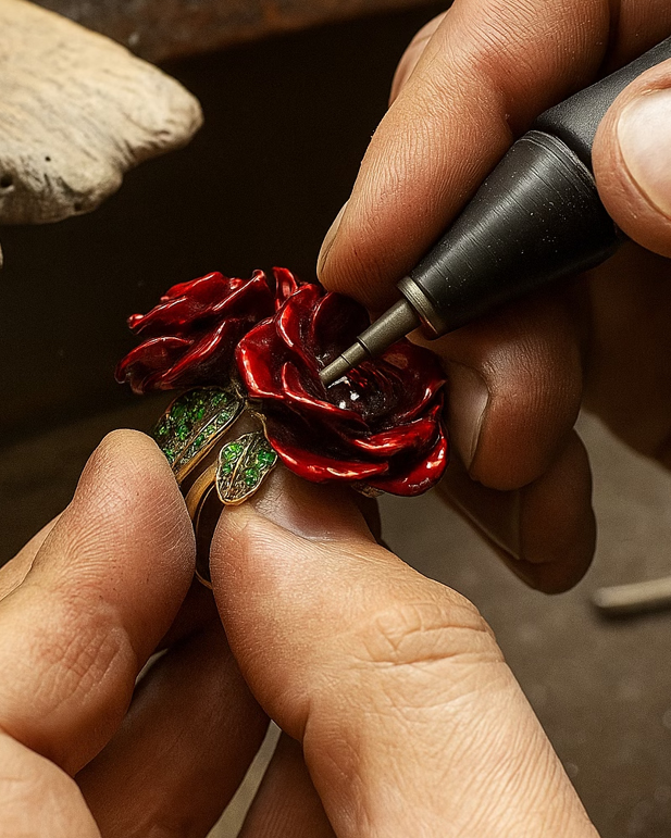 העושר המהפנט שבקולקציה בא לידי ביטוי בעבודת שיבוץ מוקפדת וייחודית.כל תכשיט נוצר בתשומת לב מרבית, תוך שימוש בחומרי גלם מובחרים ובטכניקות שיבוץ מתקדמות, המבטיחות משחקי אור ועומק עוצרי נשימה.התכשיטים עשויים מבראס איכותי במיוחד, שעובד ברמת גימור גבוהה ומצופה בזהב 18 קראט בעובי 1 מיקרון, המעניק להם מראה זוהר ועמידות לאורך שנים. זו קולקציה שחוגגת רגישות ליופי המגוון שבצבעוניות. אבני החן, הגדלות במעבדה, משובצות ביד בטכניקת "שיבוץ שיניים" – שיטה זהה לזו שמאפיינת תכשיטי יהלומים, ומעניקה לכל תכשיט זוהר ונצנוץ מיוחד. זו הזמנה לחוויה סוחפת, מלאה בפרטים, עם סטייטמנט אופנתי שקשה להתעלם ממנו